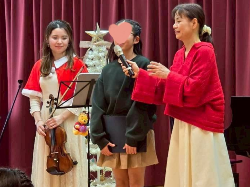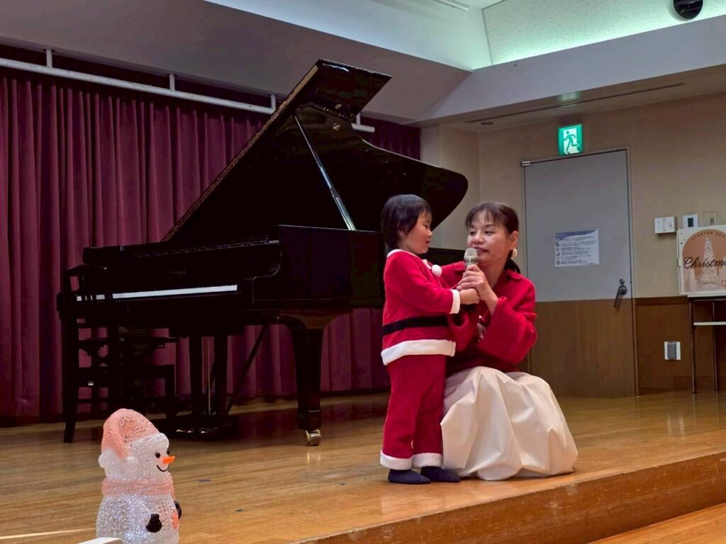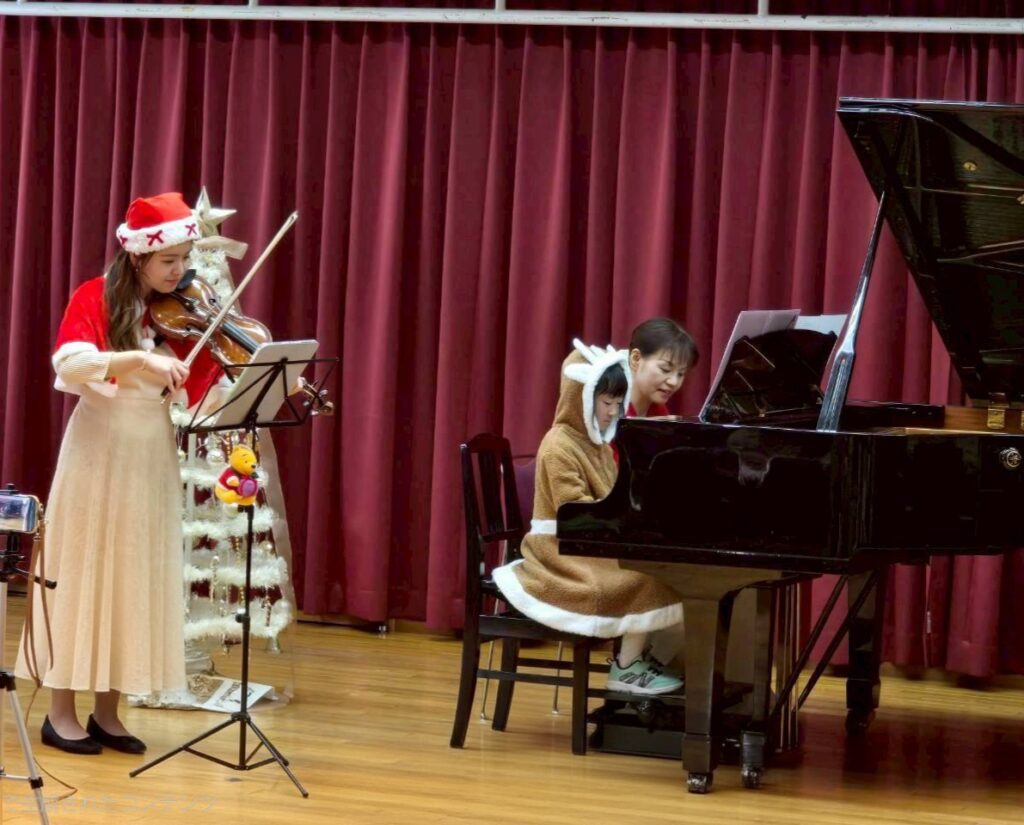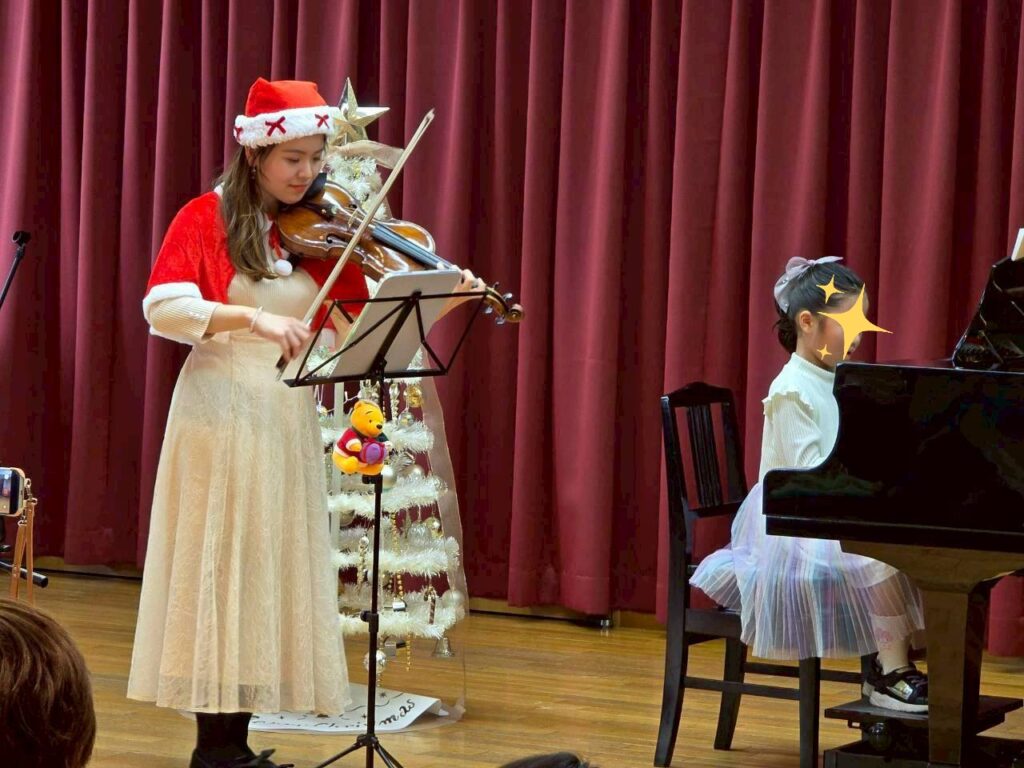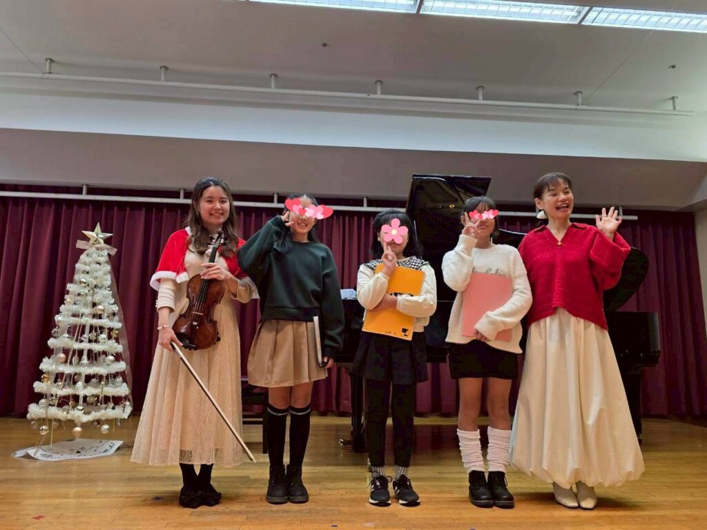 柏原市国分のピアノ、リトミック、バイオリン ブロッサム音楽教室クリスマス会を開催♪ こんにちは、井谷美智子です。 お天気にも恵まれ、1歳~60歳代まで幅広い年齢層の方にご参加いただき、欠席者もなく最高のクリスマス会となりました! ちびっ子サンタ達の「あわてんぼうのサンタクロース」は可愛らしさ満点。 幼児さん達はそれぞれソロステージもがんばりました。 普段とは違う我が子の姿が見られたと親御さんからも好評でした。 小学生以上はバイオリンのみき先生と素敵にアンサンブル。 「小さな世界」「おもちゃのチャチャチャ」ブルグミュラー、ソナチネなどをそれぞれ演奏。 アンサンブルをする時には“音を聴く”ということがとても大事。 一人で弾いているときには気付けないポイントがいろいろあって。 だからこそ、二人の音が重なりあったり音で会話するような場面がうまくいったりすると、とっても楽しいです。 兄弟の参加もOKの「にじ」を歌おうのコーナーでは、子供たちがまるで本物の虹のように色とりどりのスカーフを振ってくれました。 急遽結成した“大人チーム”によるミュージックベル。 快く引き受けて下さったパパ2人、大人の生徒さん2人、中学生一人。 当日5分のリハーサルだけで見事な「喜びの歌」を披露。 クリスマス曲をソロ演奏してくれた5年生達。 小さな子供たちが憧れる存在に成長してくれました。 年長さん以上の小学生チームでの合奏「赤鼻のトナカイ」 全員で合わせたのはこの日が初めてだったけど、見事にバッチリ決まりました。 幅広い年齢層でのプレゼント交換は、もらう人のことを一生懸命考えて選んでくれたプレゼントを持ち寄りました。 番号カードをくじ引き形式で順番に取って、ドキドキしながら一斉にオープン! 緊張から解き放たれて今日一番のいい笑顔があふれました。 年々上手になっていくみんなのお陰で、イベントでいろんなことができるようになってきました。 みんなのがんばりに拍手! そして、メリークリスマス♪ 体験レッスンのお問い合わせはこちらからどうぞ