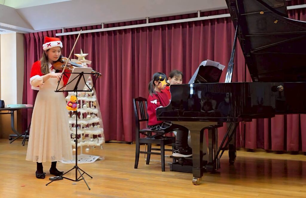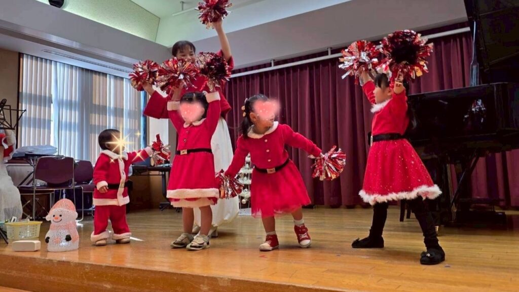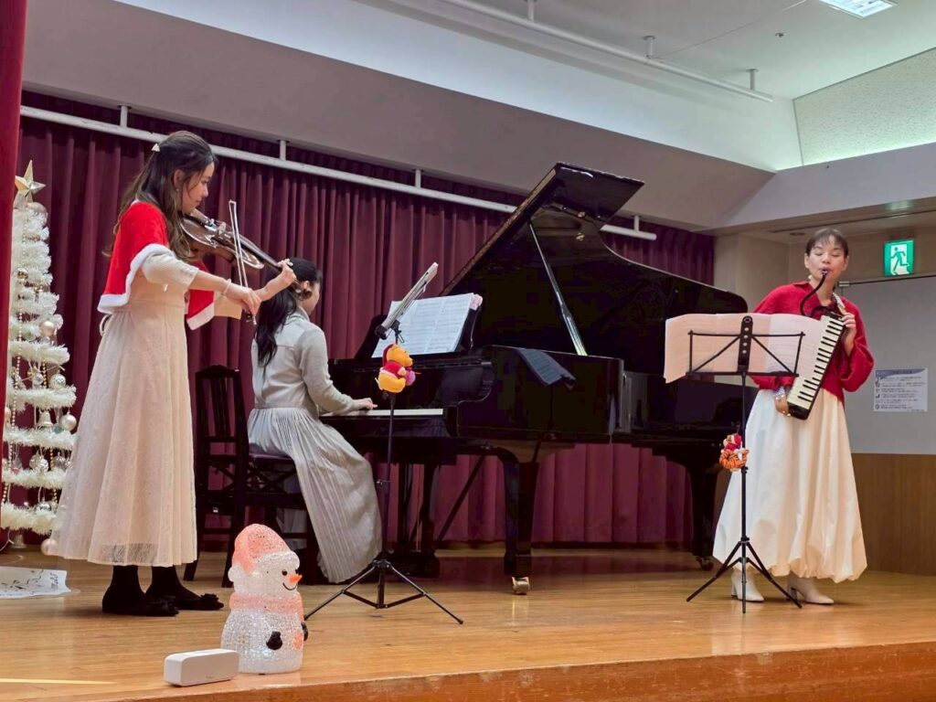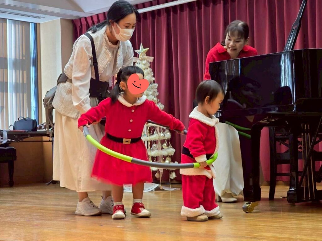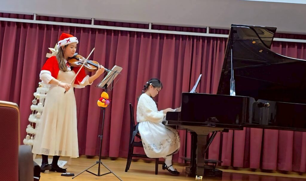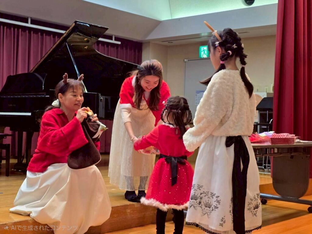 柏原市国分のピアノ、リトミック、バイオリン ブロッサム音楽教室クリスマス会を開催♪ こんにちは、井谷美智子です。 お天気にも恵まれ、1歳~60歳代まで幅広い年齢層の方にご参加いただき、欠席者もなく最高のクリスマス会となりました! ちびっ子サンタ達の「あわてんぼうのサンタクロース」は可愛らしさ満点。 幼児さん達はそれぞれソロステージもがんばりました。 普段とは違う我が子の姿が見られたと親御さんからも好評でした。 小学生以上はバイオリンのみき先生と素敵にアンサンブル。 「小さな世界」「おもちゃのチャチャチャ」ブルグミュラー、ソナチネなどをそれぞれ演奏。 アンサンブルをする時には“音を聴く”ということがとても大事。 一人で弾いているときには気付けないポイントがいろいろあって。 だからこそ、二人の音が重なりあったり音で会話するような場面がうまくいったりすると、とっても楽しいです。 兄弟の参加もOKの「にじ」を歌おうのコーナーでは、子供たちがまるで本物の虹のように色とりどりのスカーフを振ってくれました。 急遽結成した“大人チーム”によるミュージックベル。 快く引き受けて下さったパパ2人、大人の生徒さん2人、中学生一人。 当日5分のリハーサルだけで見事な「喜びの歌」を披露。 クリスマス曲をソロ演奏してくれた5年生達。 小さな子供たちが憧れる存在に成長してくれました。 年長さん以上の小学生チームでの合奏「赤鼻のトナカイ」 全員で合わせたのはこの日が初めてだったけど、見事にバッチリ決まりました。 幅広い年齢層でのプレゼント交換は、もらう人のことを一生懸命考えて選んでくれたプレゼントを持ち寄りました。 番号カードをくじ引き形式で順番に取って、ドキドキしながら一斉にオープン! 緊張から解き放たれて今日一番のいい笑顔があふれました。 年々上手になっていくみんなのお陰で、イベントでいろんなことができるようになってきました。 みんなのがんばりに拍手! そして、メリークリスマス♪ 体験レッスンのお問い合わせはこちらからどうぞ